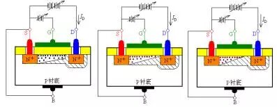 当Vgs>Vgs(th),且固定为某一值时,来分析漏源电压Vds对漏极电流ID的影响。Vds的不同变化对沟道的影响如图所示。