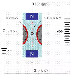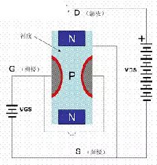 MOS管应用电压的极性和我们普通的晶体三极管相同,N沟道的类似NPN晶体三极管,漏极D接正极,源极S接负极,栅极G正电压时导电沟道建立,N沟道MOS管开始工作,如图1-4-B所示。同样P道的类似PNP晶体三极管,漏极D接负极,源极S接正极,栅极G负电压时,导电沟道建立,P沟道MOS管开始工作,如图1-5-B所示。