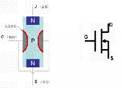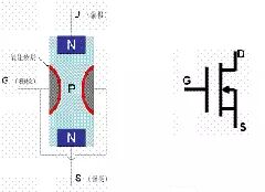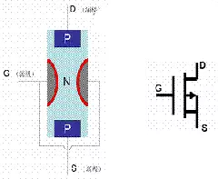 同样用上述相同的方法在一块掺杂浓度较低的N型半导体硅衬底上,用半导体光刻、扩散工艺制作两个高掺杂浓度的P+区,及上述相同的栅极制作过程,就制成为一个P沟道(PNP型)增强型MOS管。图1-2所示A 、B分别是P沟道MOS管道结构图和代表符号。