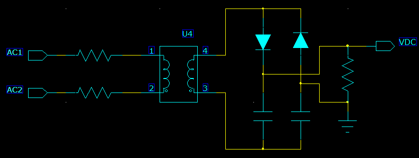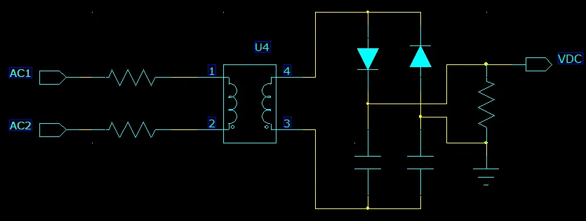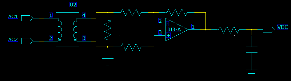 该电路适合电压采样也适合电流采样,图中的变压器,用于电压采样,则是变压器,用于电流采样,则是电流互感器,变压器与互感器可以认为是相反使用的,比如变压器一般用于降低电压,匝数比50:1,而互感器,则降低电流,匝数比1:50,互感器输出一般需要有闭合回路的终端,比如一个小电阻,这个读者自己调整。
