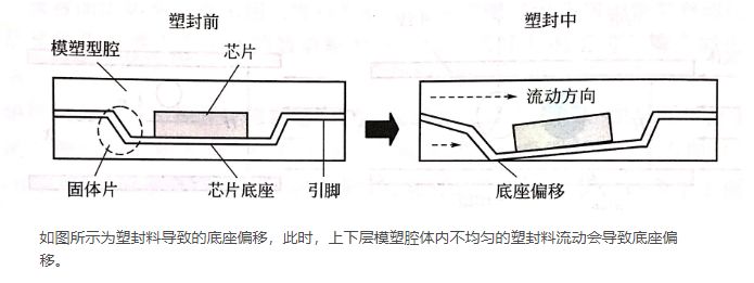 如图所示为塑封料导致的底座偏移,此时,上下层模塑腔体内不均匀的塑封料流动会导致底座偏移。