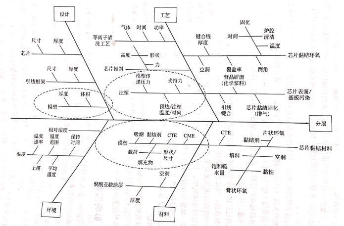 这一张图所示的是展示塑封芯片分层原因的鱼骨图,从设计、工艺、环境和材料四个方面进行了分析。通过鱼骨图,清晰地展现了所有的影响因素,为失效分析奠定了良好基础。