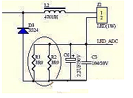 先看一个简单的电路图,是通过采样电阻R1和R2对流过LED灯的电流采样,然后调整PWM输出,以保证不同电压下流过LED灯的电流恒定。
