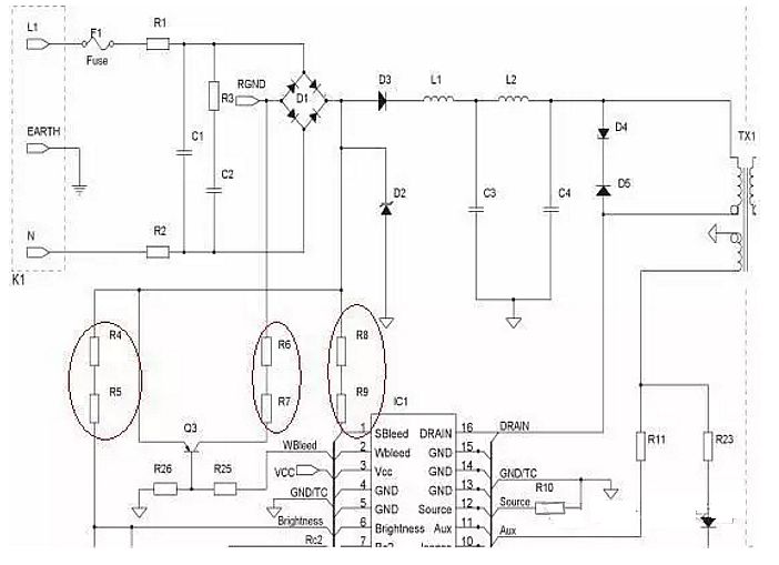 再来看上面的电路,如果我们把R4和R5合并成一个1/4W 1M的插件电路,功率上讲是没有问题的,但是230V交流通过整流桥后可以产生最高325V的直流电压,这样就会让这个电阻长时间工作在300V左右的电压下,时间一长,就会损坏这个电阻,但如果是用两个510K的电阻串联,每个电阻只分到大约150V的电压,就可以保证电路长时间稳定工作。